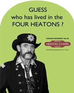 ![]() | 20. 'Lemmy' - Ian Fraser KilmisteIn Stockport in Lemmy's early years 1960 -1970, he joined local bands the Rainmakers and then the Motown Sect who played northern clubs. In 1965, he then joined The Rockin' Vickers. He next became a member of Hawkwind from 1971 to 1975 and sang lead vocals on their hit "Silver Machine". In 1975, he was fired from Hawkwind after an arrest for drug possession. He then founded the rock band Motörhead, as lead singer, bassist and primary songwriter. The band's success peaked around 1980 and 1981, including the hit single "Ace of Spades". He lived in Heaton Moor in the early 1960s. |